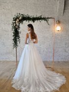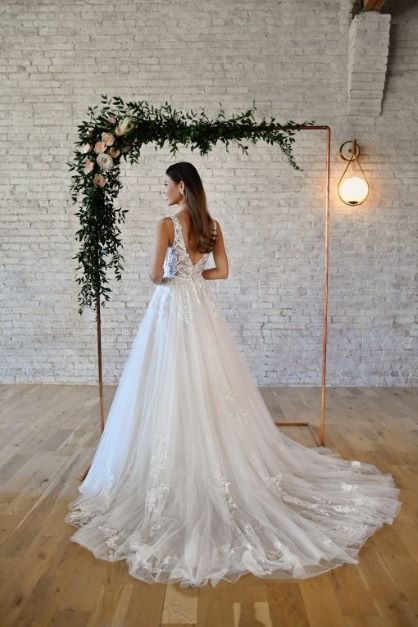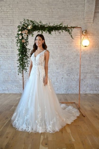 A stunning wedding dress in ivory/almond. Straps which give a low plunge neckline in pretty lace and a full ballgown skirt with the lace detailing. Train