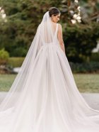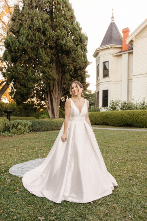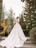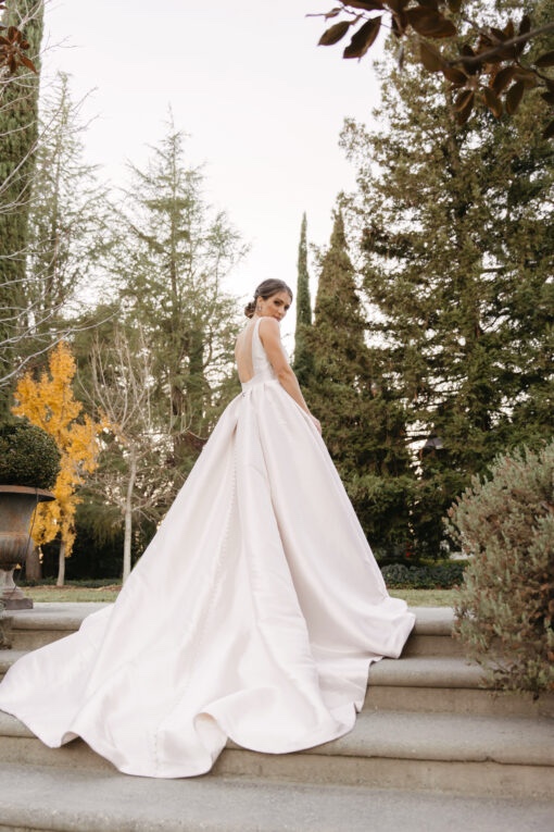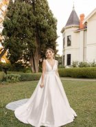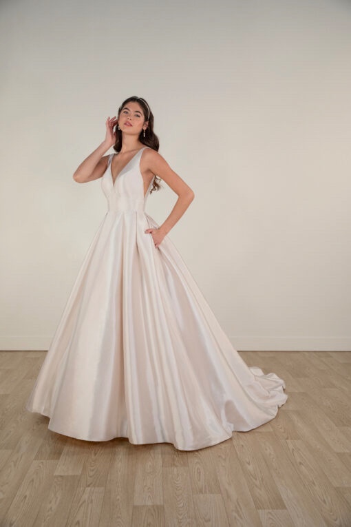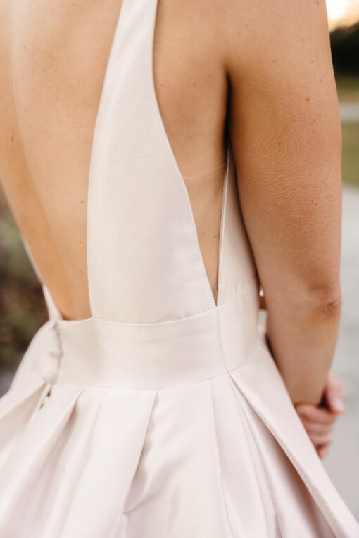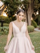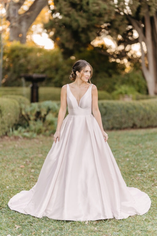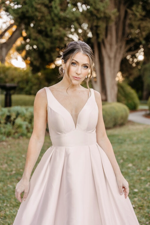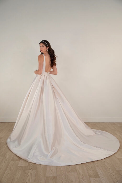 in mikado fabric this dress is in a soft blush colour. Wide straps fall into a deep plunge and flattering wide waist band, long train and buttons set this dress apart from the rest,